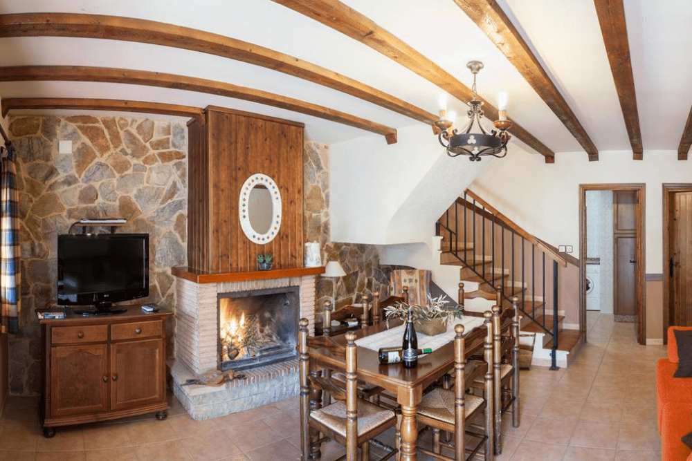El interior está formado por 2 o 3 dormitorios, según capacidad, alguna de ellas consta de salón con chimenea y leña gratuita, un baño completo, cocina equipada con menaje y utensilios y porche exterior cubierto.