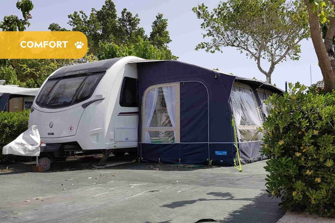 La zona de acampada está preparada para ofrecer el máximo confort: desagüe, conexión de TV, conexión de agua y conexión eléctrica de 220v.