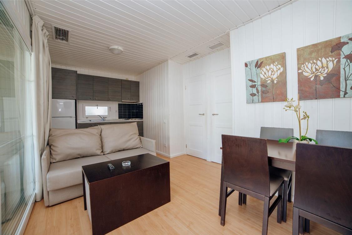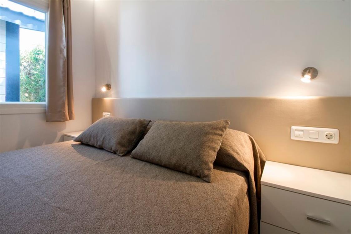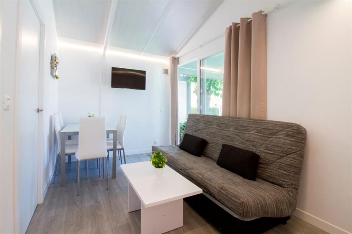 Los bungalows Creta Confort Plus ofrecen 46 m2 y capacidad para 6 personas. Se distribuyen en cocina, salón, baño y dos habitaciones. En el exterior cuentan con una bonita terraza amueblada y zona de jardín.