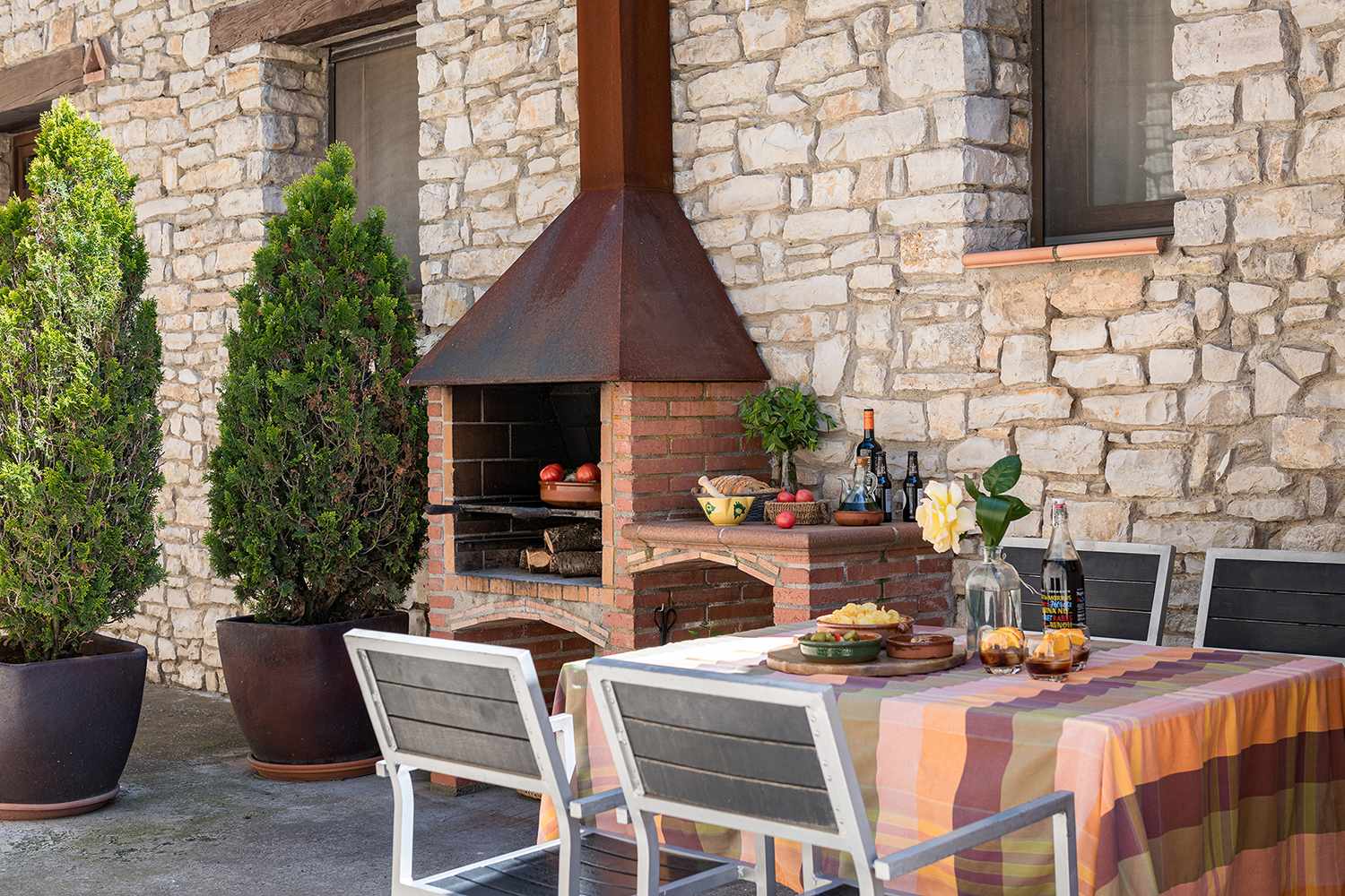 La Cort ofrece espacio para 4 personas en un alojamiento distribuido en dos habitaciones de matrimonio, un baño, sala de estar con chimenea, comedor y cocina equipada. Exterior con barbacoa y mobiliario de jardín.