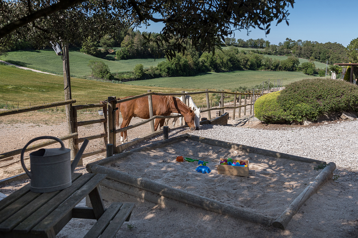 Se puede disfrutar de un cuidado jardín, piscina exterior, sala de juegos con ping pong y una zona de granja con caballos. Adicionalmente se puede reservar una sesión privada a la psicina climatizada, SPA.