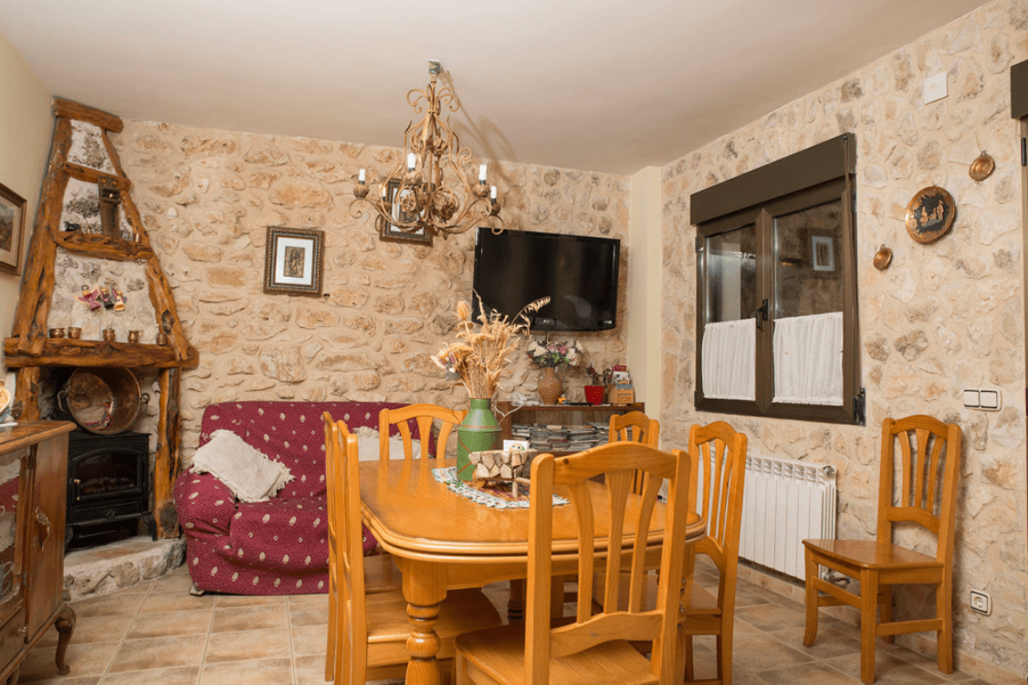 La casa cuenta con una amplia cocina totalmente equipada con vitrocerámica, horno, lavavajillas, nevera, microondas… perfecta para realizar comidas y cenas agradables y disfrutarlas además en su amplio comedor con paredes de piedra y muebles rústicos de estilo castellano, tan característicos de los pueblos de Soria. En dicho salón podremos pasar agradables tardes y noches al calor de su chimenea, decorada en piedra y madera.
