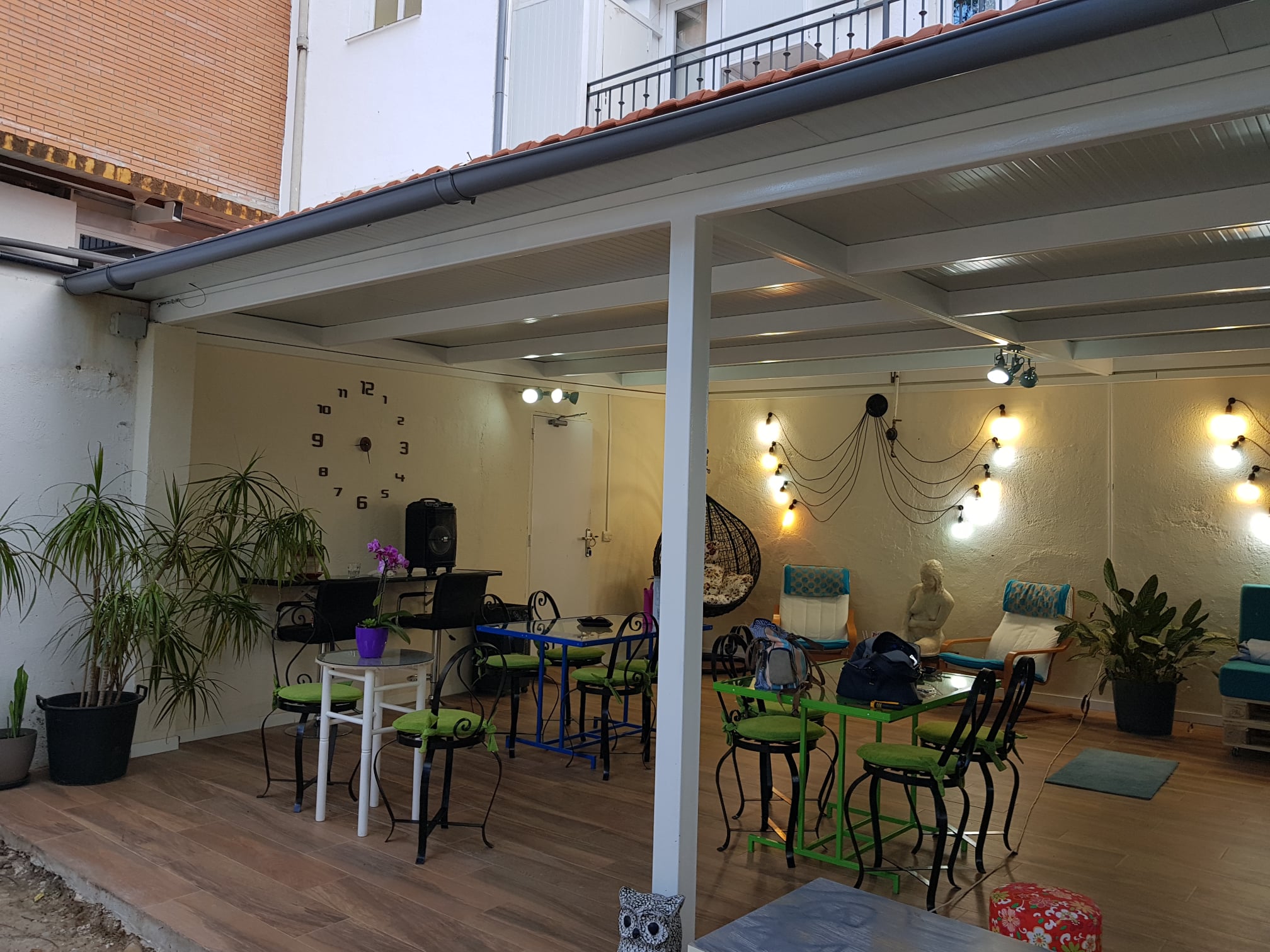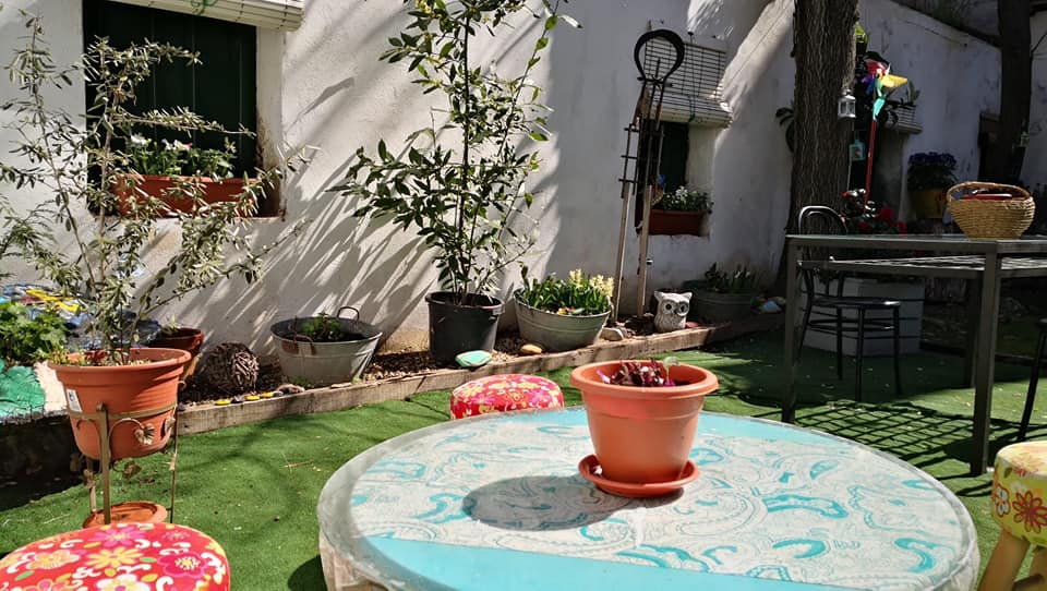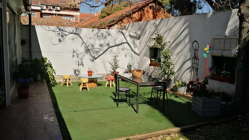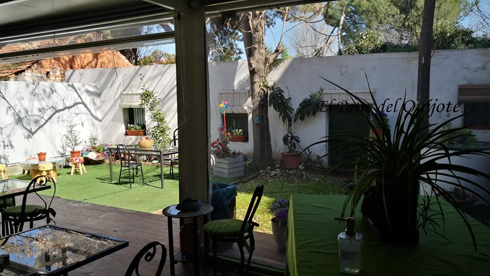 En el exterior ofrece un espacio acogedor. Se trata de un patio con terraza cubierta donde en ocasiones se realizan conciertos, talleres, reuniones, entre otros eventos.