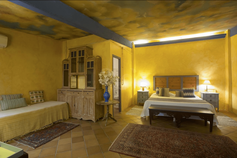 La habitación triple se distribuye en una cama de matrimonio, una cama individual, salita con chimenea de leña y baño privado.
