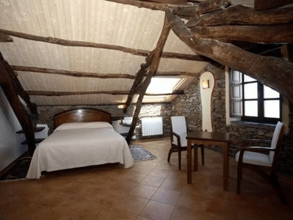 Habitación Galicia: Situada en la planta segunda, bajo el tejado. En su rehabilitación se han respetado los elementos estructurales originales. Tiene una cama de 150 cm y admite tres camas supletorias. Desde las ventanas se divisa el mar y en los días claros, la Estaca de Bares a 25 km. El baño cuenta con bañera de hidromasaje para dos personas.