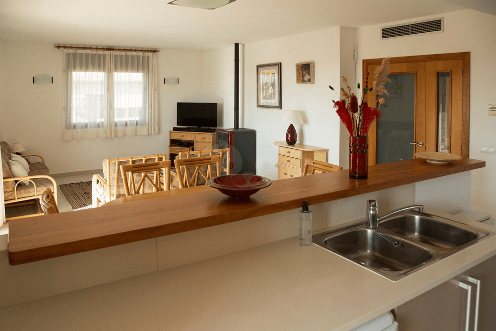 Casa Ter cuenta con capacidad para 4 personas y se distribuye en 2 plantas con jardín privado. El interior está formado por salón con estufa de pellet, comedor, cocina, aseo, terraza, 2 habitaciones y baño.